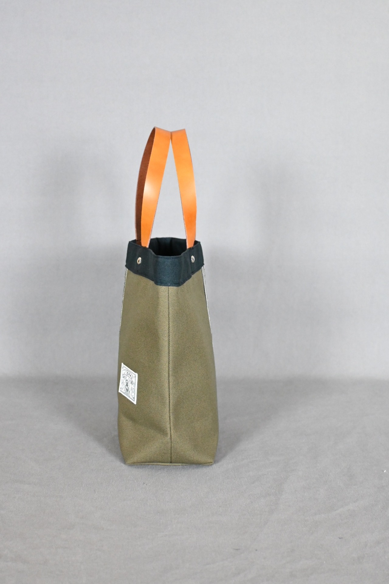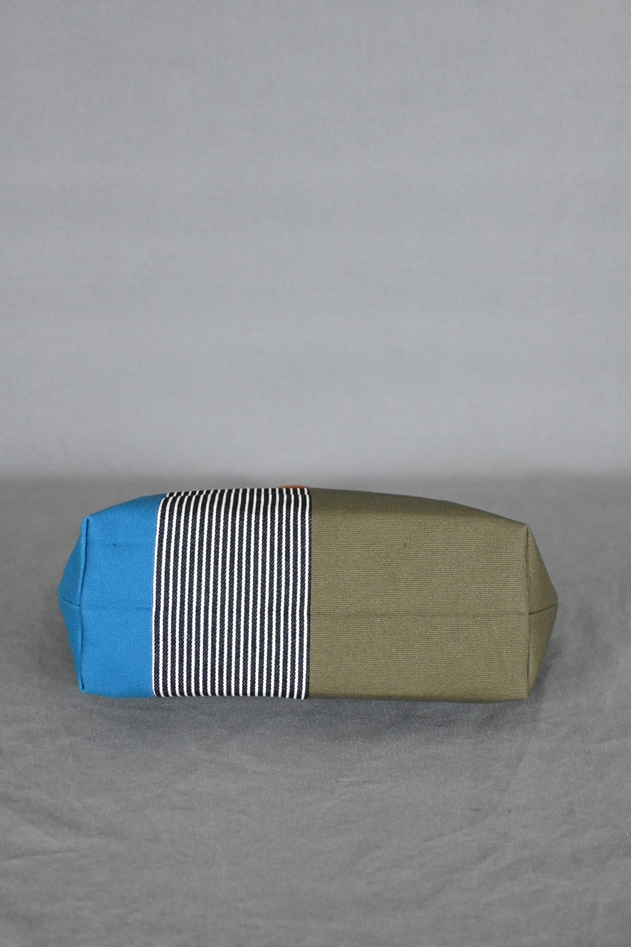 カラーはカーキ、ヒッコリー、ブルーを組み合わせ、上部のふちをダークグリーンにすることで全体の色のバランスをとっています。