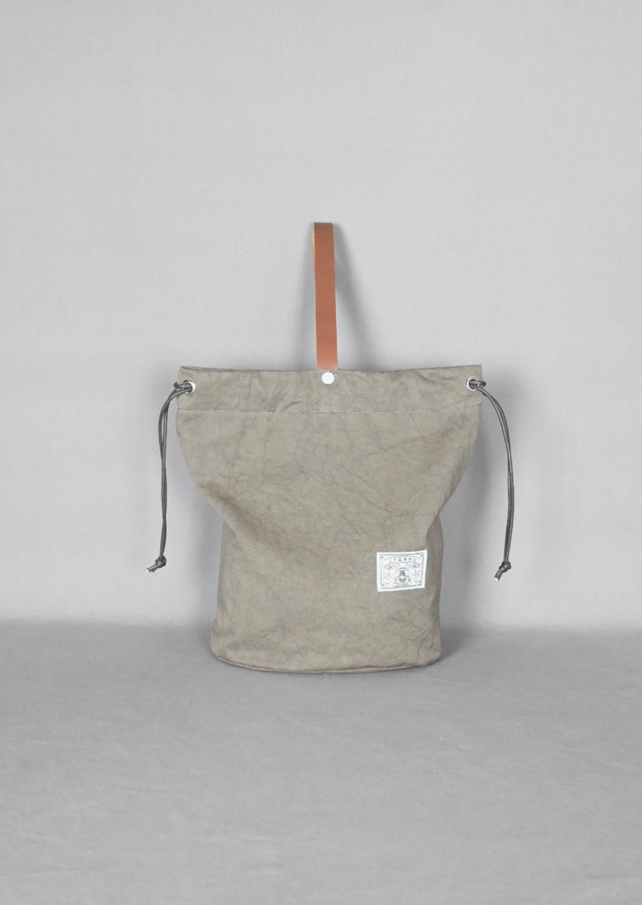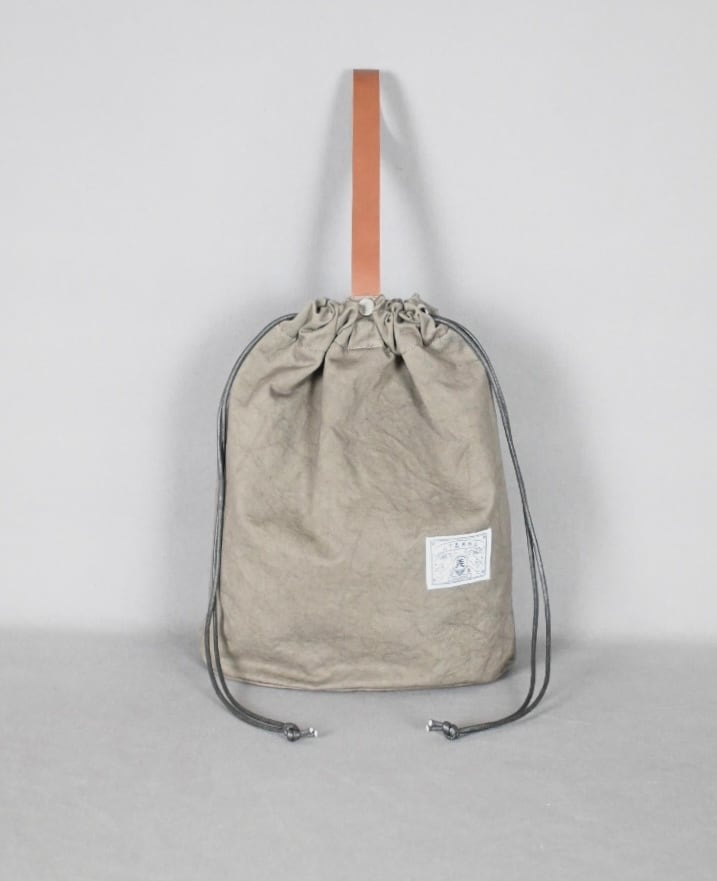 高密度でしっかりとした生地感のコットンに牛レザーのハンドルを組み合わせたオリジナルの巾着バッグです。