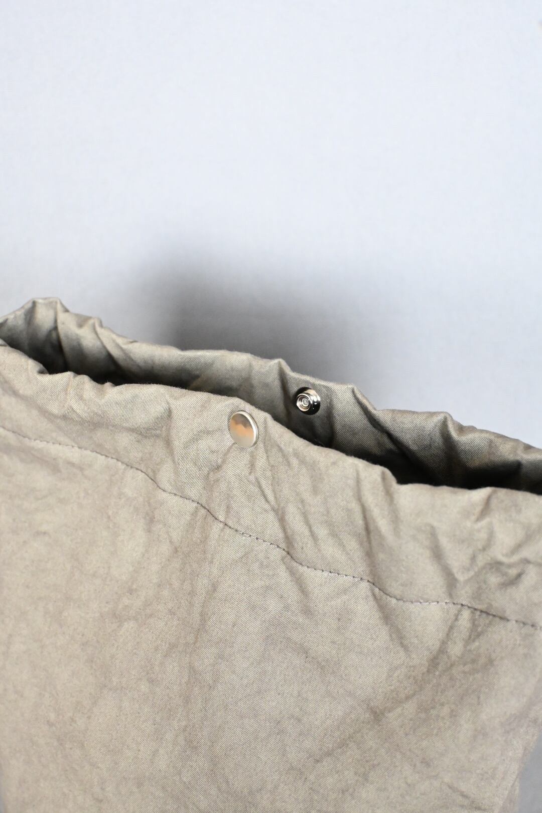 奥深い風合いと渋さのある魅力的な生地にシルバーのボタンホックを組み合わせ、男性でも女性でも使える巾着バッグとなっております。