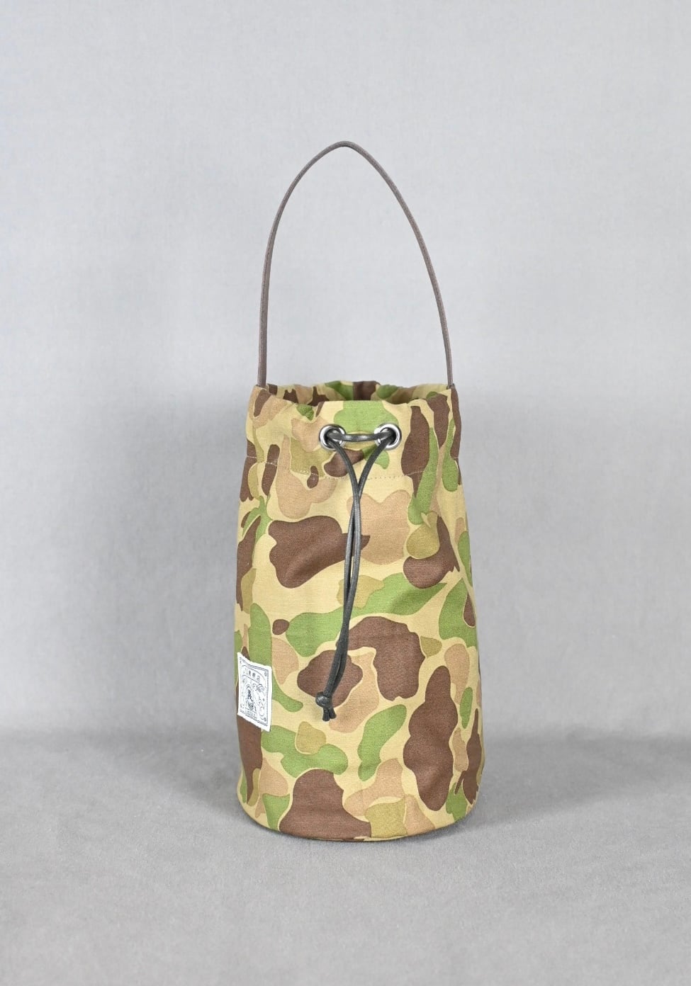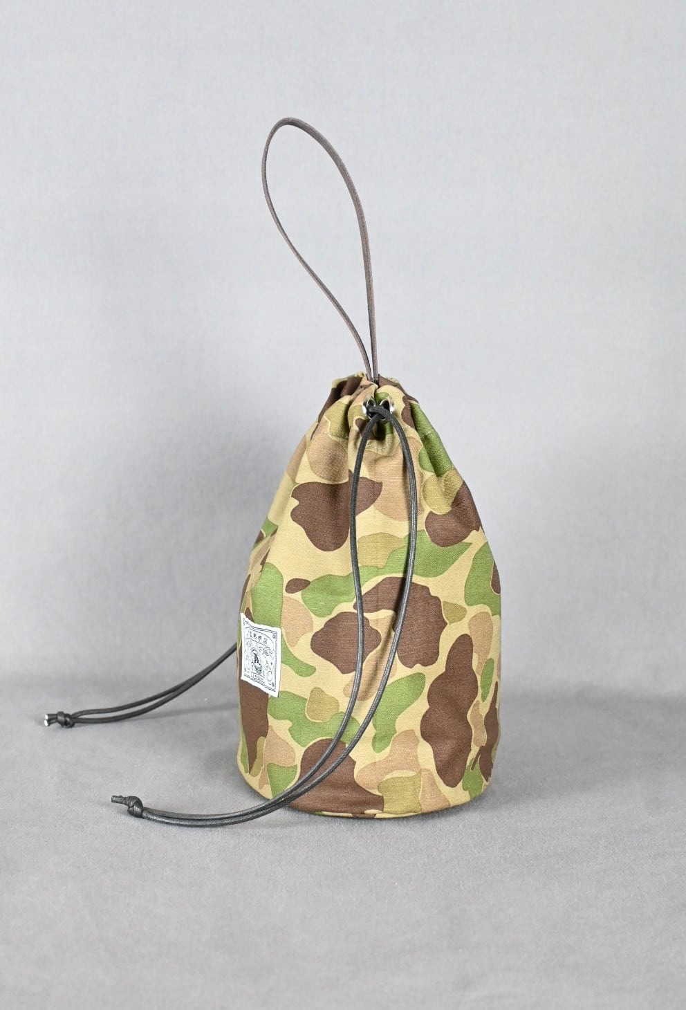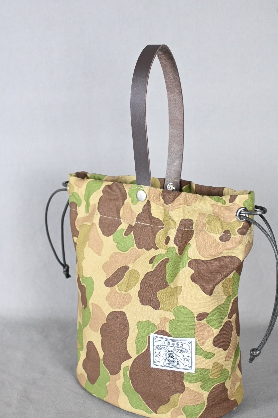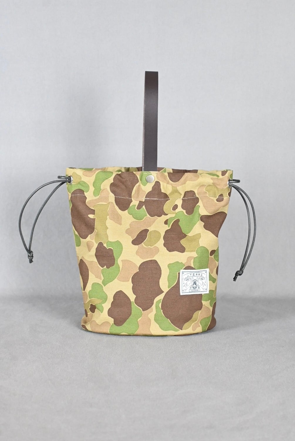ハンターカモ柄のコットン生地にダークブラウンの牛レザーのハンドル、シルバーのボタンホックを組み合わせ、男性でも女性でも使える巾着バッグとなっております。
