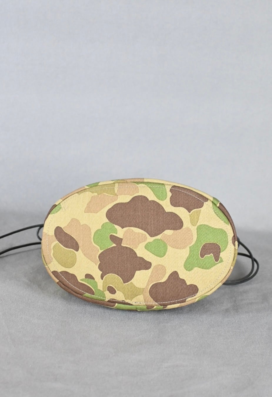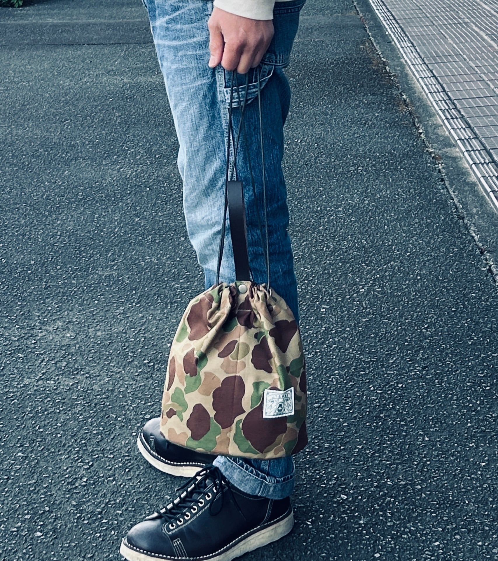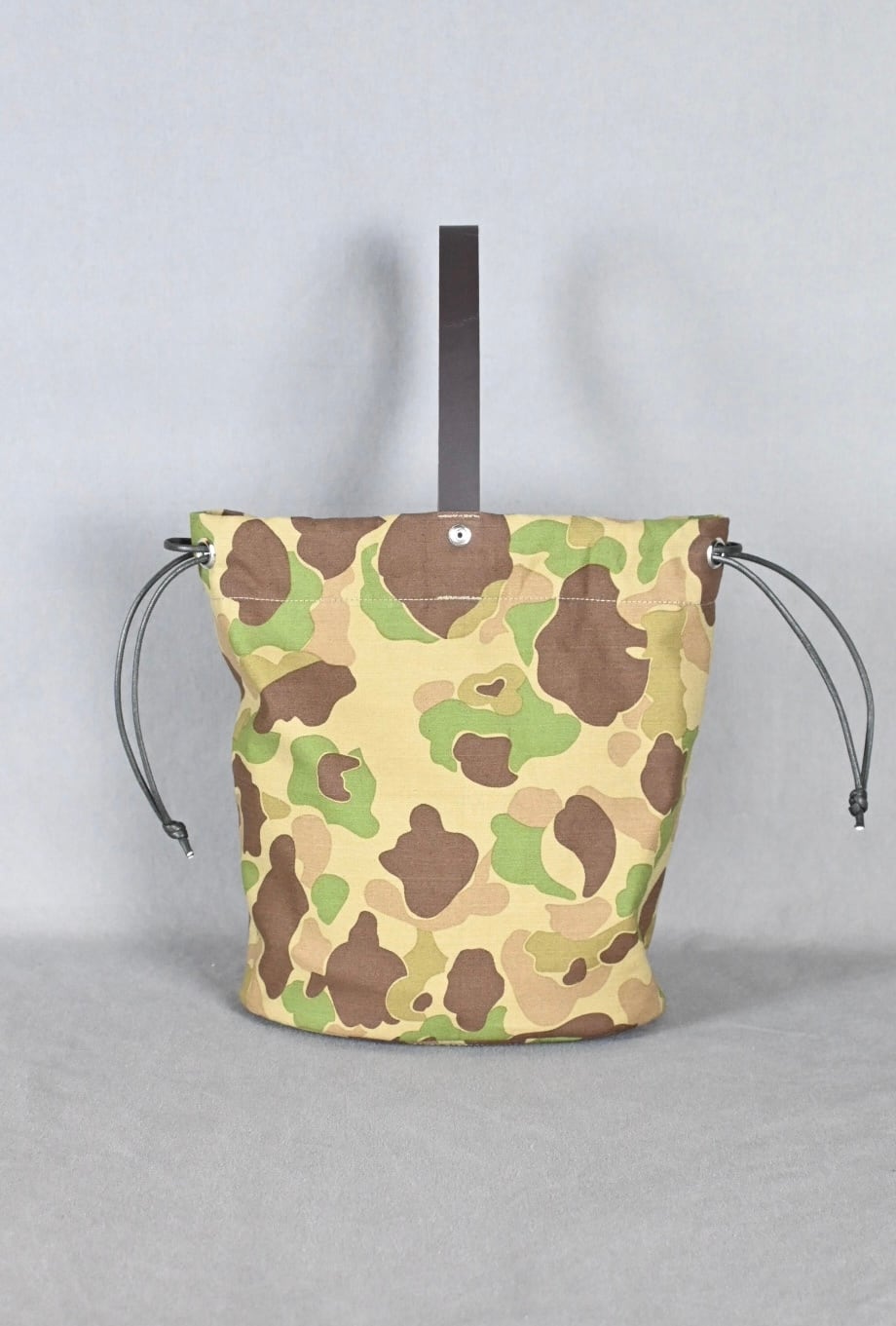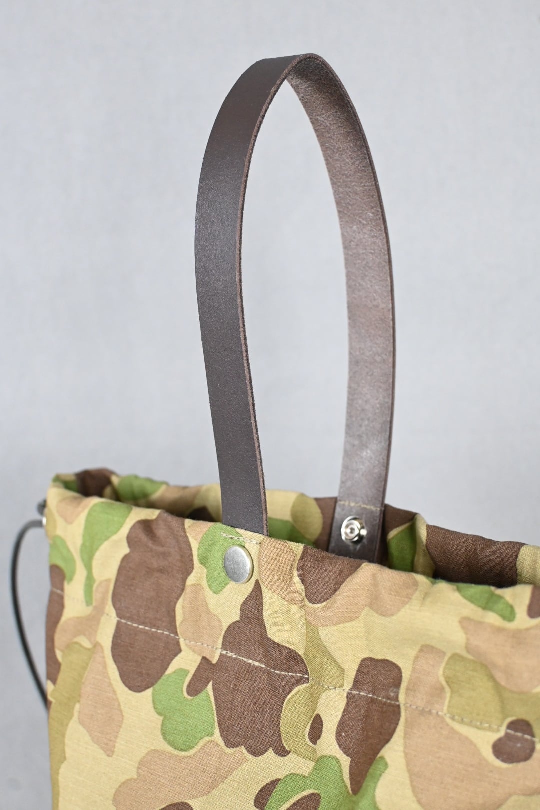 ハンターカモ柄のコットン生地にダークブラウンの牛レザーのハンドル、シルバーのボタンホックを組み合わせ、男性でも女性でも使える巾着バッグとなっております。